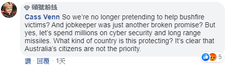 所以,我们不再帮助山火的受害者?不再对因疫情而失业的澳洲人伸出援手? 反而让澳洲人在网络安全和远程导弹上花费数百万澳元。莫里森到底想保护哪个国家?显然,澳大利亚公民不是他的优先事项。
