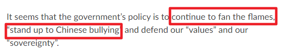 Allan Behm指出,很明显地,从网络攻击到突袭工党议员的住处,再到增加澳洲国防预算,莫里森的联邦政府,就是希望持续煽风点火,点燃澳洲民众对中国对立的意识。