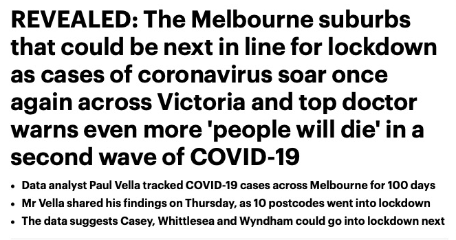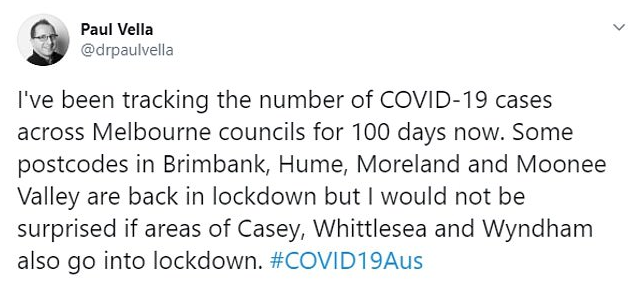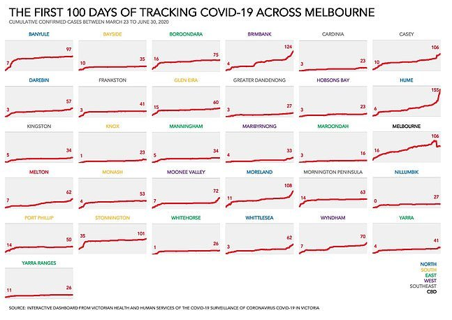 数据分析师Paul Vella也同时贴出他长期下来追踪维州各区确诊数量的分析表,上头显示出从3月23日至6月30日之间,100天内墨尔本累计新冠病例的情况。